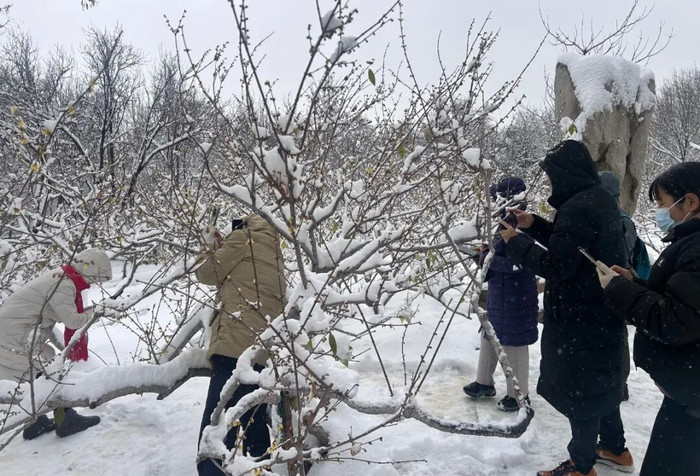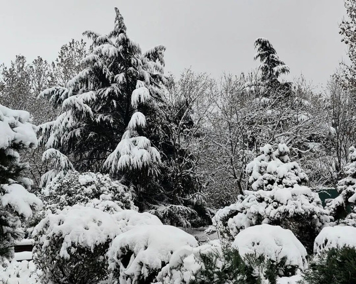 植物园内,耐寒植物与白雪相拥,松枝挂雪、竹影摇霜,尽显自然清冽之美。