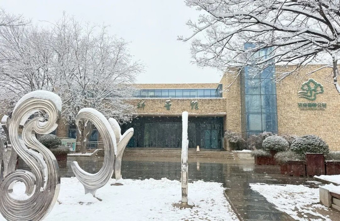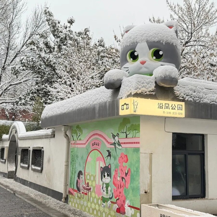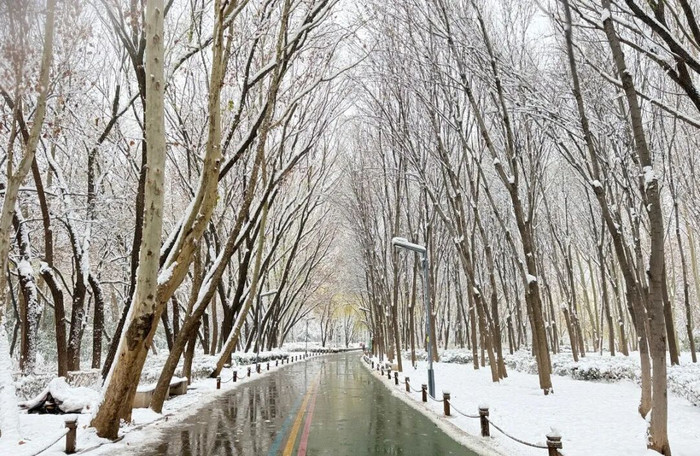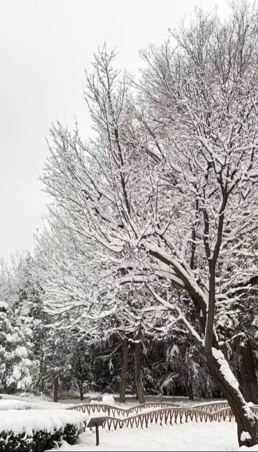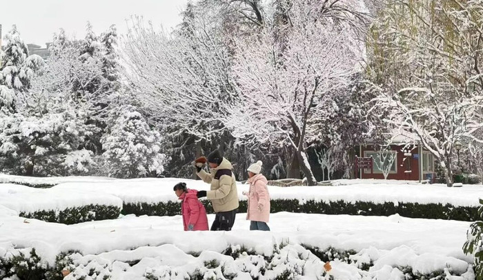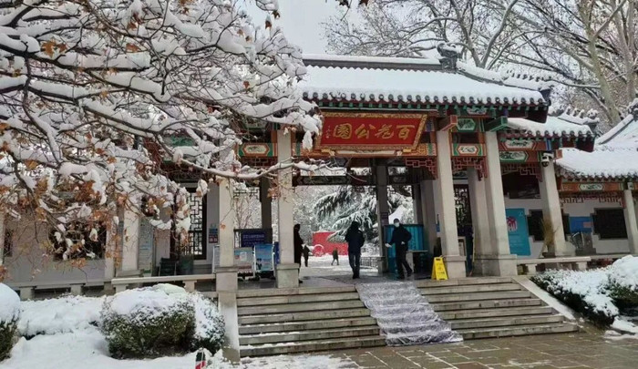 百花公园的雪后风光清新灵动,健身区域、广场被积雪点缀,暖阳下的白雪与绿植相映成趣。
