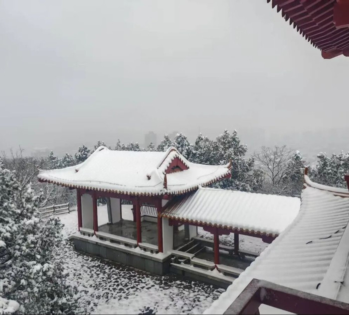 英雄山的雪景兼具豪迈与静谧,白雪覆盖的山体与山间步道相映,登山远眺,泉城雪景尽收眼底。