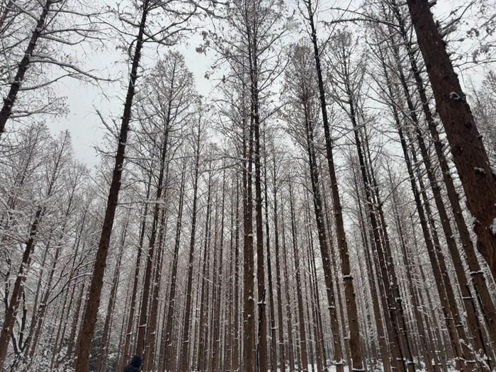 森林公园里,成片林木银装素裹,林间雪道蜿蜒,漫步其中仿佛闯入童话秘境。