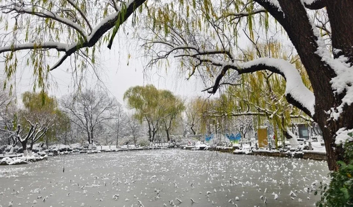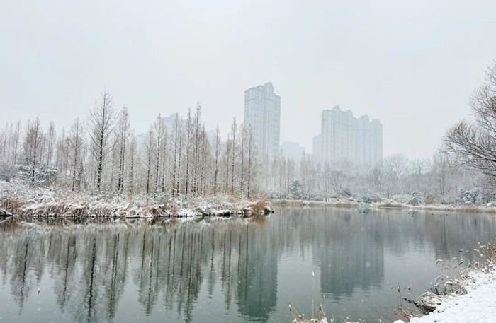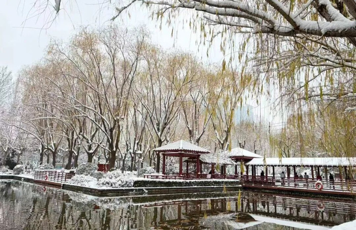泉城公园的雪后景致雅致温婉,湖面倒映着雪覆亭台,步道旁的绿植裹着白纱,每一步都踏在诗意之中。