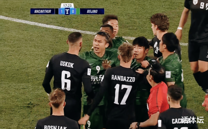对手的身体对抗优势明显,北京国安很难在中场占到便宜,只能通过边路寻找传中的机会。池忠国飞铲布拉坦,引发双方的冲突,幸亏裁判和双方球员及时拉开,避免冲突进一步的扩大。