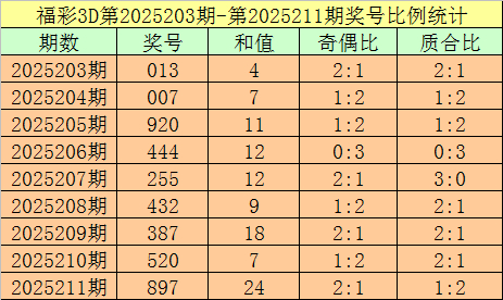 开奖回顾:福彩3D第2025211期:奖号为897,奖号质合比为1:2,大小比为3:0,跨度为2,类型为组六。