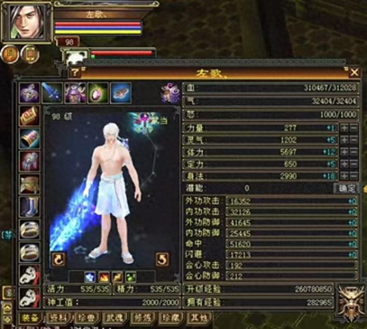 血量31万(这个血量真的很可以了,同区几位其他门派7级大佬也就32万血),蓝量3.2万,内功攻击3.2万,命中5.1万,闪避1.7万,会心攻击192,会心防御212。