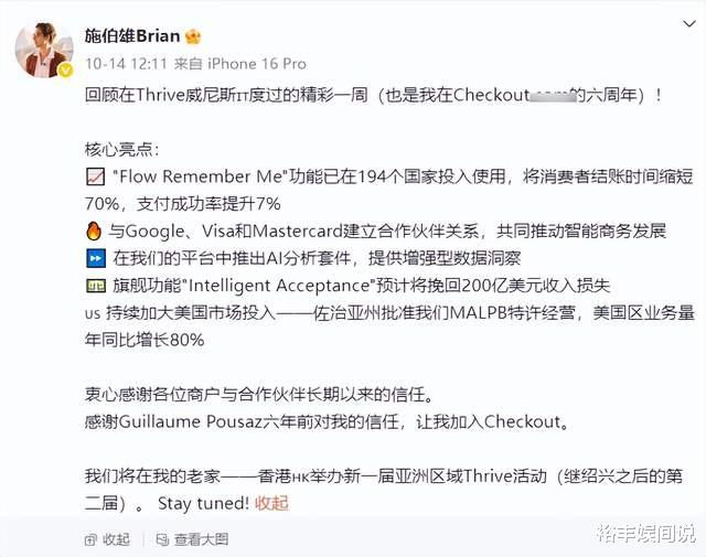 14号的时候,施伯雄还曾分享这一时刻,他表示,今年是他在公司的第六年,并感谢各位商户与合作伙伴长期以来的信任,感谢Guillaume Pousaz六年前对他的信任,让其加入Checkout。