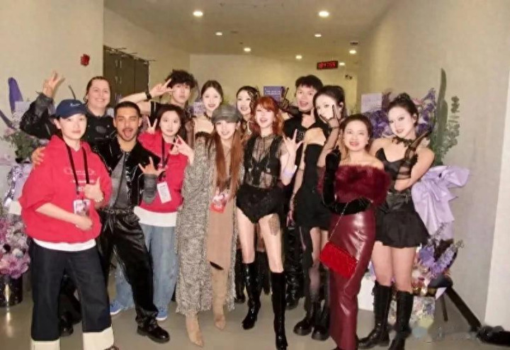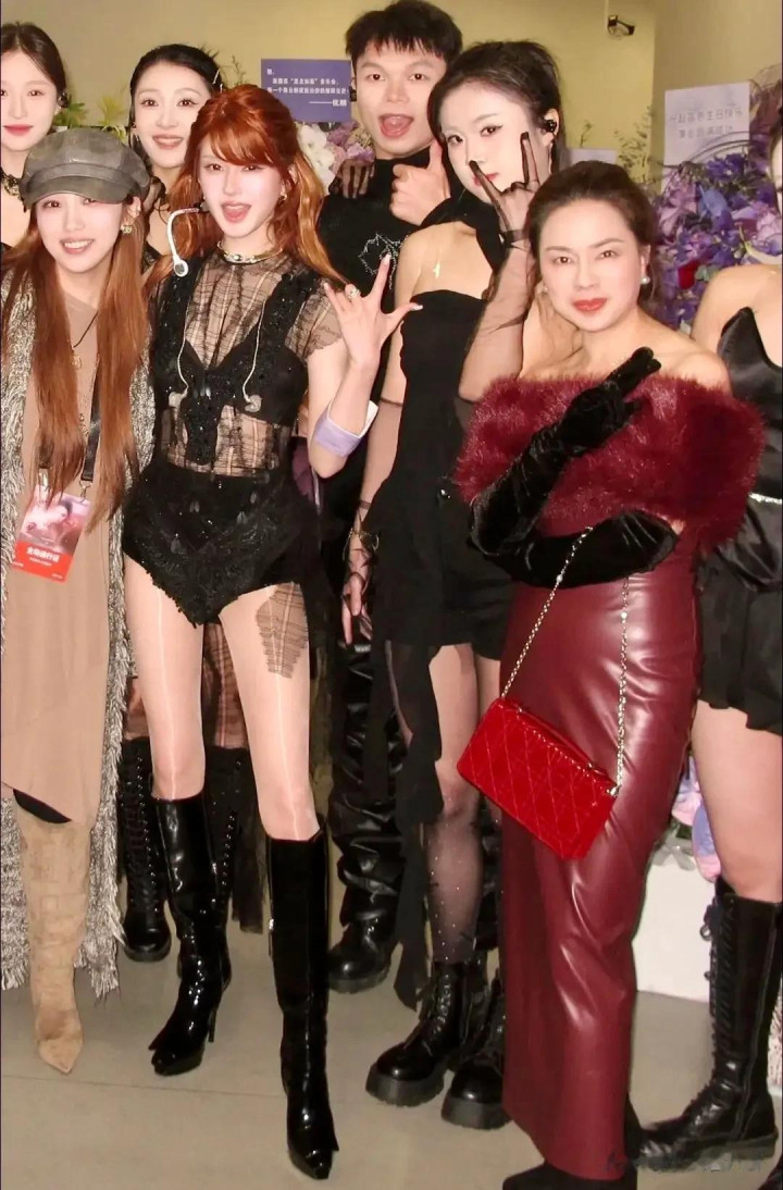 赵露思演唱会后台大合照曝光! 一旁的露思妈妈狐领红皮衣太潮了