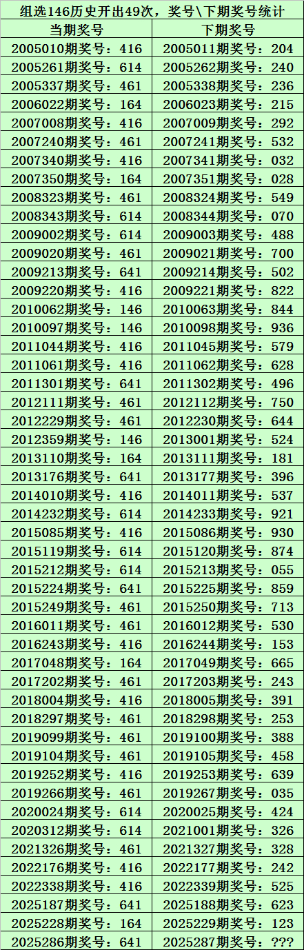 二、组选146分析:排列三历史上已开出49次组选号码146了,其奖号和下期开出奖号统计如下:
