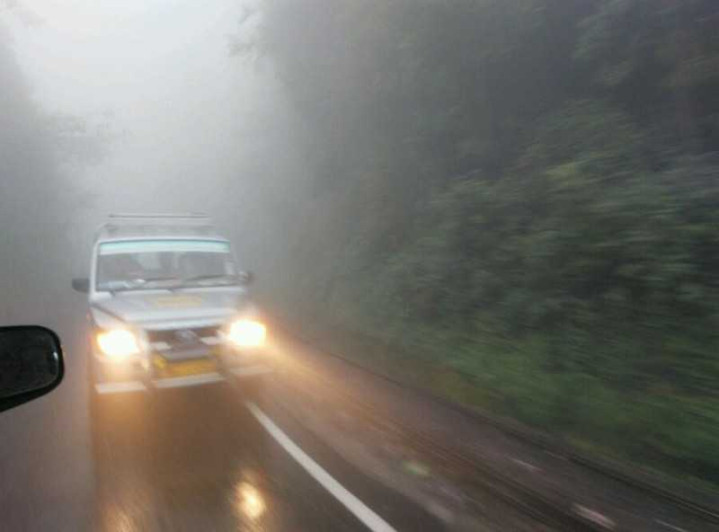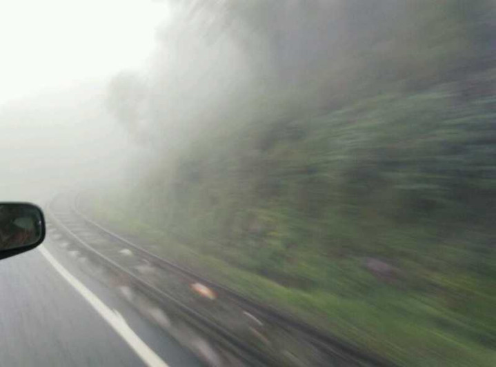 山间的烟雾弥漫在山路上,可见度不足二十米,以至于要开灯行驶。