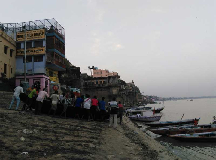 回去的路上看到一群人把一艘新完成的小船推入恒河,场面还是很有意思的。