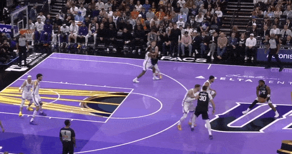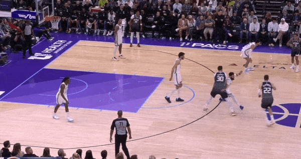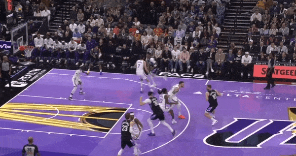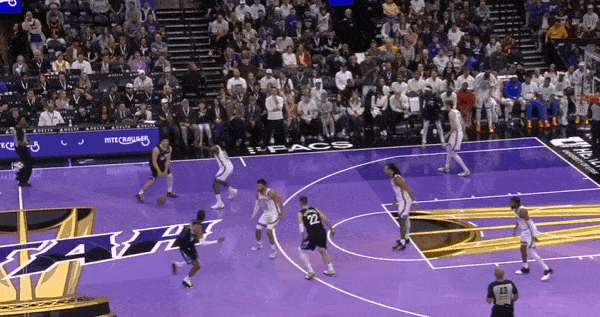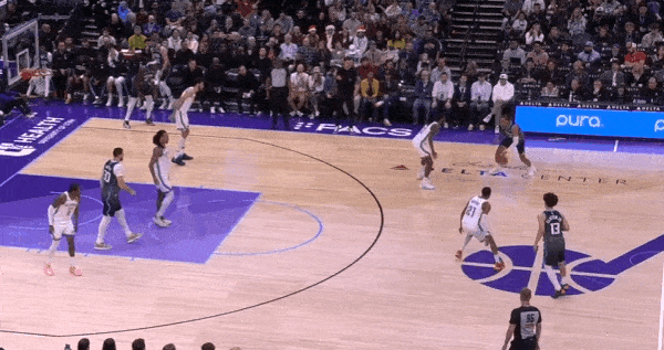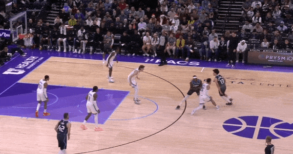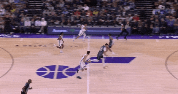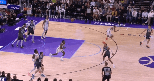 菲利借助弩机的“Flare Screen”空手移动后顺势向篮下卷切获得身位优势,卡森成功预判乔治传球路线,斜刺里杀出在菲利接到球之前直接双手将球抢走,避免了切特被调离禁区的情况下篮下被打穿。