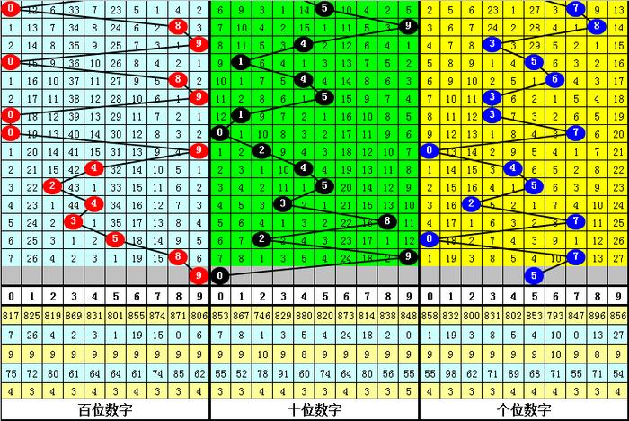 百位分析:上期百位开出奖号:8,最近9期该位奖号大小比为3:6,其中大号5、8、9出现1次,6、7出现0次,小 号0、4出现2次,2、3出现1次,1出现0次,本期百位参考大号,胆码关注9。