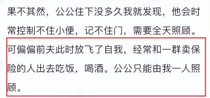 然而,更令她生气的还在后面:在公公待在北京的这段时间里,史宏竟一直在外边“花天酒地”,从来不管自己大小便失禁、头脑还迷糊的父亲。