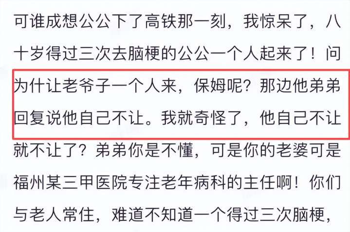 可令她没想到的是,当公公从动车上下来时,身边竟是一个人都没有,而当她问公公:为什么保姆没跟来时,公公竟说:“弟弟家不让跟来!”