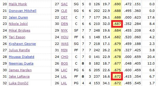 事实上,新赛季至今拉拉维亚合计出手65次、真实投篮67.2%。单就进攻终结效率而言,完全可以比肩约基奇的存在。
