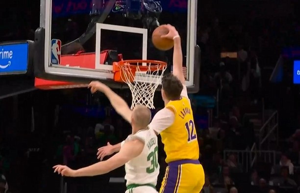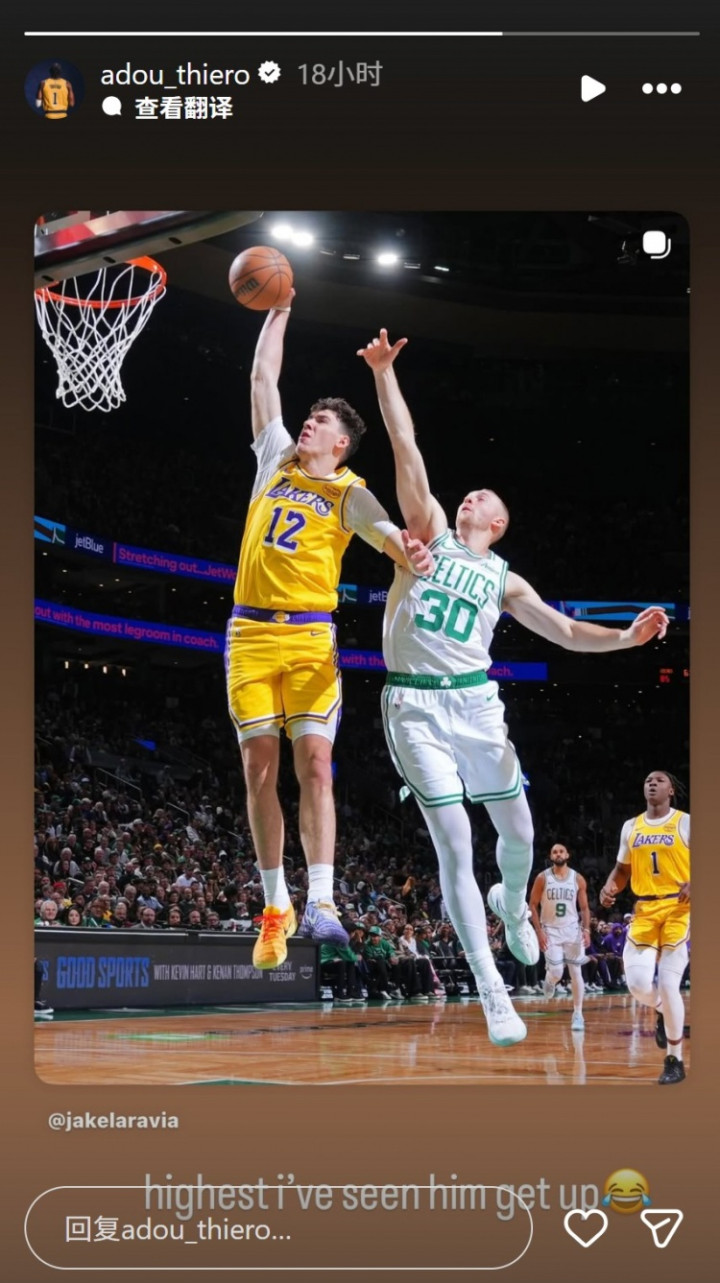 此前打凯尔特人拉拉维亚抢断反击一条龙,起飞滑翔单臂劈扣。湖人新秀蒂耶罗今日在INS调侃道:“这我见过他跳得最高的一次。”